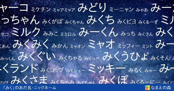 満孔(みく)ちゃん , 歌姫(みく)ちゃん , 翠来(みく)ちゃん , 路久(みく)ちゃん , 美果(みく)ちゃん , 愛桜(みく)ちゃん , 実薫(みく)ちゃん , 美花(みく)ちゃん , 心咲(みく)ちゃん , 來未(みく)ちゃん , 望匂(みく)ちゃん , 未来(みく)くん , 海虹(みく)ちゃん , 海来(みく)ちゃん , 碧紅(みく)ちゃん , 美咲(みく)ちゃん , 愛空(みく)ちゃん , 美きかんしゃ トーマス 魔法の線路 歌;未来(みく) の最初の音は「み」で、ま行で始まる音は、ママ、まるいなどやさしさや包容力を感じさせる意味が多く、「 おだやか 」「 包容力 」などのイメージがあります。